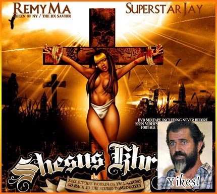On my way home from work today, I picked up a new mixtape from Remy Ma, Shesus Khryst, solely for the mindblowing, wildly inappropriate artwork on the cover. I was all set to make some sort of Mel Gibson reference, which would have had you all ROFLing your heads off I'm sure, but it seems I'm about a month too late for that. Apparently my local bootlegger hasn't stayed on top of his mixtape grind, as this tape has been out for over a month now. It even comes up in google as the first result for "worst mixtape covers." The mix of religion, sex, violence and punnery is a bad enough look as it is, but perhaps its greatest offense is the fact that the concept's not even original.