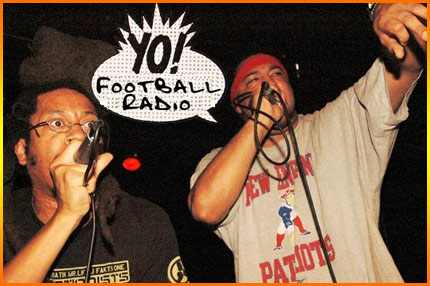 Mr Lif and Akrobatik on the weekly Yo! Football Radio show. The sports analysis is surprisingly thorough, and it's a nice change of pace from the shouting matches that the usual sports radio shows have devolved into. As you'd imagine from a production hosted by Lif and Akrobatik, the show incorporates some hip hop tracks into the mix as well, so you might want to check it out even if you're not a sports fan.